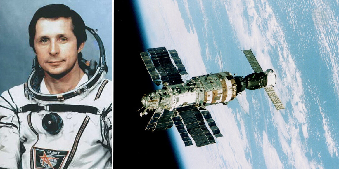 Виктор Савиных и орбитальная станция Салют-7 с пристыкованным космическим кораблём Союз-Т. Фото из архива Виктора Савиных