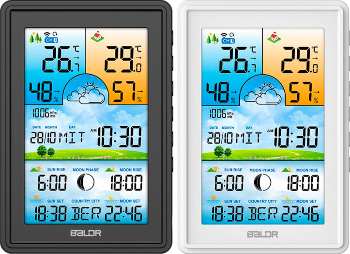 Домашняя метеостанция BALDR B0360WST2H2PR V2 сочетает в себе наглядный прогноз погоды и точные измерения микроклимата с удобными повседневными функциями. На цветном дисплее отображаются понятный значок прогноза и подробные показания температуры и влажности как в помещении, так и по данным внешнего датчика – вы сразу увидите всю картину текущих атмосферных условий. Встроенный барометр анализирует изменения атмосферного давления и дополняет прогнозирование, а память максимальных и минимальных значений помогает отслеживать наиболее значимые колебания показателей, оценивать динамику и вовремя реагировать на изменения в доме и за его пределами.