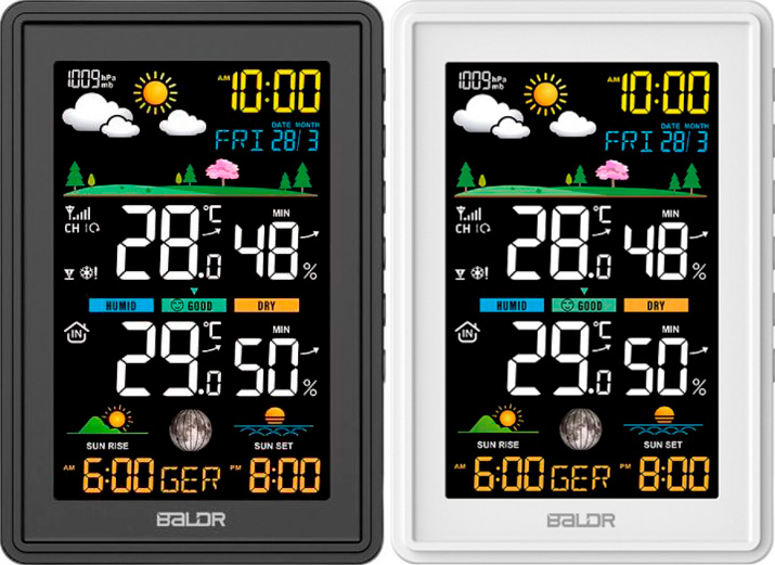 Домашняя метеостанция BALDR B0360WST2H2PR V3 закрывает все ежедневные задачи по контролю микроклимата в помещении, погоды за окном и времени. Цветной дисплей с наглядным значком прогноза погоды помогает моментально понять, чего ожидать от природы в ближайшее время, а ключевые показатели визуально организованы так, чтобы их было видно с первого взгляда без лишних действий и переходов по меню.