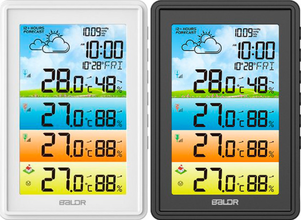 Метеостанция BALDR B0360WST4H4PR была создана для точного и удобного контроля атмосферы сразу в нескольких зонах. В комплекте – 3 беспроводных выносных датчика, которые можно разместить на улице или в других комнатах, чтобы видеть климатическую картину по дому или за его пределами. На крупном цветном дисплее в режиме реального времени отображаются данные выбранных каналов работы, поэтому ключевые параметры не нужно искать по меню – все самое важное находится перед глазами.