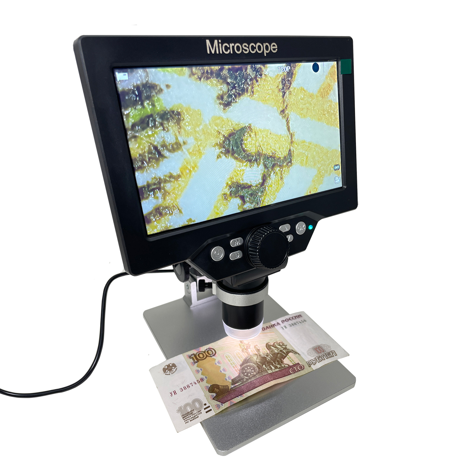 Увеличение: 50–1200x. Цифровой USB-микроскоп с ЖК-дисплеем 7", встроенным рекордером и камерой 12 Мпикс. Со светодиодной подсветкой